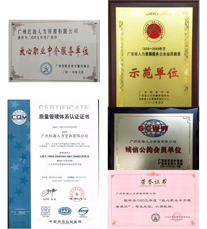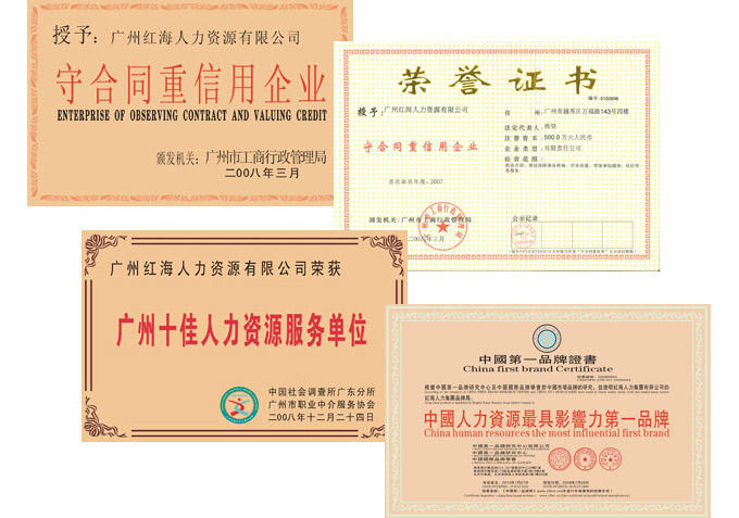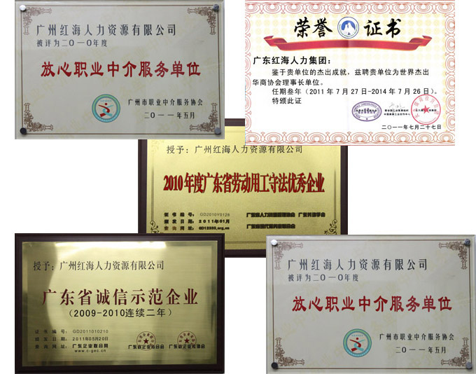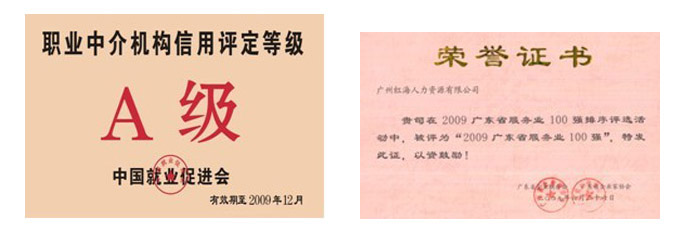 2010年6月獲得由廣州市職業(yè)中介服務(wù)協(xié)會(huì)頒發(fā)的《2009放心職業(yè)中介服務(wù)單位》及《2010年度放心職業(yè)中介服務(wù)單位》的榮譽(yù)稱號(hào);
