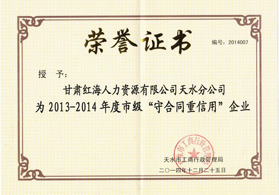 2014年12月初,由甘肅省工商行政管理局指導,天水市工商行政管理局主辦開展了“2013-2014年度守合同重信用企業(yè)”評選活動,活動旨在進一步推進企業(yè)信用體系建設,增強企業(yè)的法律意識、合同意識,全面提升企業(yè)市場競爭力,促進全市經(jīng)濟社會持續(xù)健康發(fā)展。