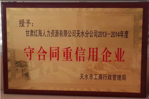 經(jīng)過一個多月的評選,甘肅紅海人力資源有限公司天水分公司在評選企業(yè)中脫穎而出,成為本地人力資源行業(yè)中唯一一家獲此榮譽的企業(yè)。天水市工商行政管理局于2月4日授予甘肅紅海人力資源有限公司天水分公司 “2013-2014年度守合同重信用企業(yè)”榮譽稱號。