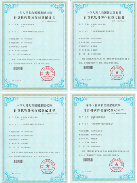 為在企業(yè)辦公軟件競爭激烈、同行實力良莠不齊的市場環(huán)境下更好地保護企業(yè)自主知識產(chǎn)權(quán),紅海科技公司將協(xié)同辦公系統(tǒng)下的“紅海OA計劃管理系統(tǒng)”、“紅海E-HR管理軟件”、“紅海行政軟件管理系統(tǒng)”、“紅海收付款管理系統(tǒng)”四大子系統(tǒng)申請了計算機軟件著作權(quán)保護。經(jīng)一系列的網(wǎng)申、材料評審環(huán)節(jié),于2015年6月上中旬陸續(xù)獲得了由中華人民共和國國家版權(quán)局頒發(fā)的4項計算機軟件著作權(quán)。