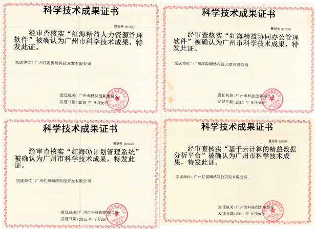 紅??萍紝?015年度已完成及重點優(yōu)化已進(jìn)行一定程度市場推廣的產(chǎn)品申請了科學(xué)技術(shù)成果登記。廣州市科技創(chuàng)新委員會通過對紅??萍嫉募t海精益人力資源管理軟件、紅海協(xié)同辦公管理軟件、紅海OA計劃管理系統(tǒng)等11項成果系列項目證明材料的審查、評定,綜合在庫同行業(yè)產(chǎn)品的信息,最終確認(rèn)為當(dāng)前先進(jìn)的產(chǎn)品,給予成果登記并頒發(fā)了相應(yīng)的證書。