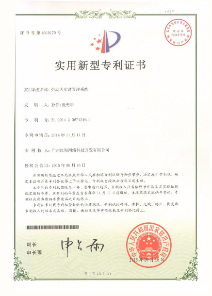 紅海科技自2014年就申報“勞動力實(shí)時管理系統(tǒng)”的實(shí)用新型專利,經(jīng)中國人民共和國國家知識產(chǎn)權(quán)局的初步審查、受理、授予通知等各環(huán)節(jié),歷時近一年,公司終于喜獲證書。
