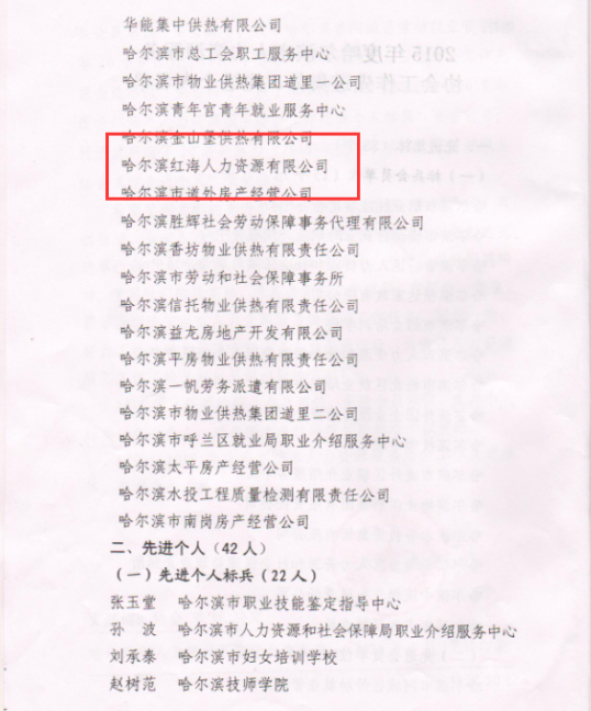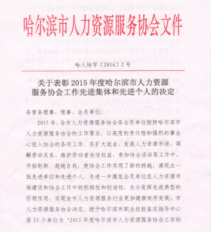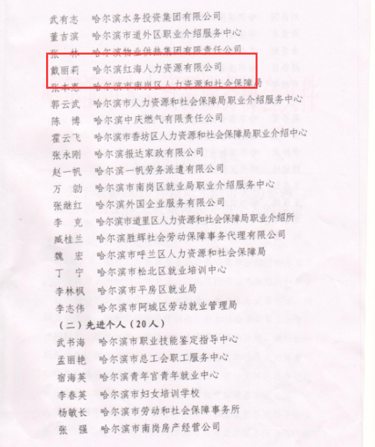 熱烈祝賀哈爾濱紅海榮獲人力資源服務(wù)協(xié)會(huì)工作先進(jìn)會(huì)員單位、總經(jīng)理戴麗莉女士榮獲先進(jìn)個(gè)人標(biāo)兵稱號