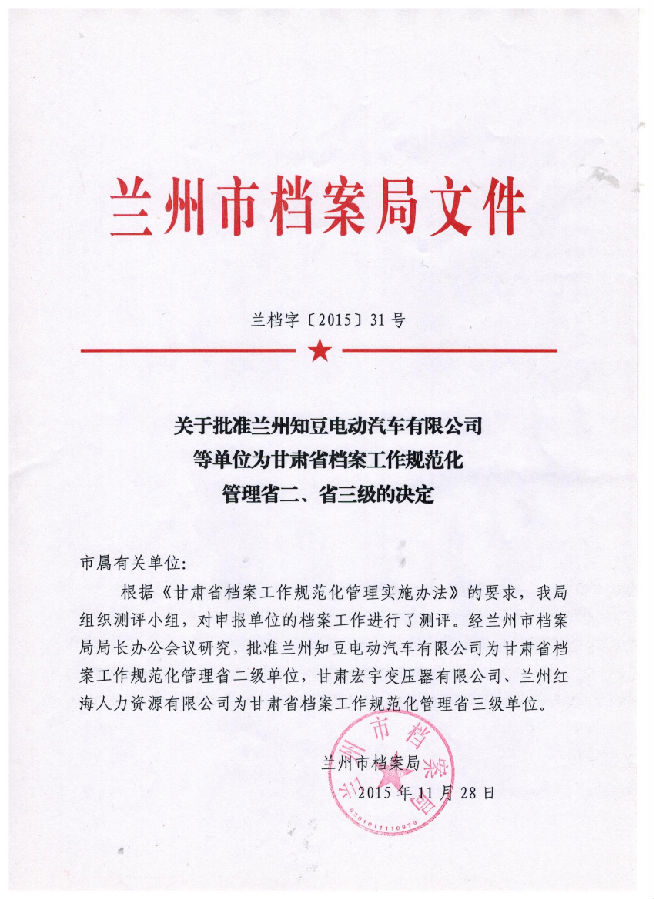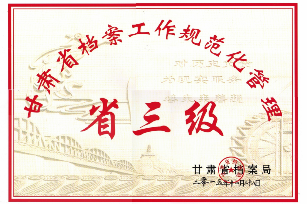 2015年11月,蘭州紅海為了進(jìn)一步加強(qiáng)檔案工作的規(guī)范化建設(shè),以努力創(chuàng)造開拓新業(yè)務(wù)點(diǎn)為目標(biāo),充分利用信息資源,依照檔案管理的相關(guān)要求,加強(qiáng)檔案資源管理,開拓工作領(lǐng)域,為豐富自身軟實(shí)力,歷時一個月對公司近年文書及業(yè)務(wù)檔案進(jìn)行了分類整理。以創(chuàng)建“省三級”為目標(biāo),在市檔案局領(lǐng)導(dǎo)的業(yè)務(wù)指導(dǎo)下,檔案管理創(chuàng)建“省三級”的工作取得明顯成效,2016年2月蘭州紅海向甘肅省檔案局提交“甘肅省檔案工作規(guī)范化管理省星級資質(zhì)評定”申請表。經(jīng)過測評,2016年3月7日,蘭州紅海收到了甘肅省檔案局親臨公司頒發(fā)的甘肅省檔案工作規(guī)范化管理省三級資質(zhì)證書。