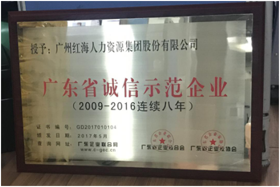 企業(yè)家們的高峰論壇結(jié)束后便進(jìn)入了領(lǐng)獎環(huán)節(jié),廣州紅海人力資源集團(tuán)股份有限公司榮獲2017年廣東省誠信示范企業(yè)獎牌。